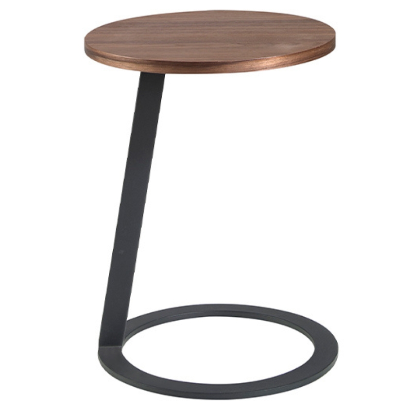 Odkládací stolek s minimalistickým designem se vyznačuje diagonálně skosenou ocelovou podnoží nesoucí kulatou desku z ořechové dýhy. Její tvar se zrcadlí v podstavě podnože a utváří tak vyvážený sjednocený vzhled stolku. Kombinace hřejivého odstínu dřeva s chladnou černou konstrukcí mu dodává kontrast, který zpestří prostor, ve kterém jej umístíte.